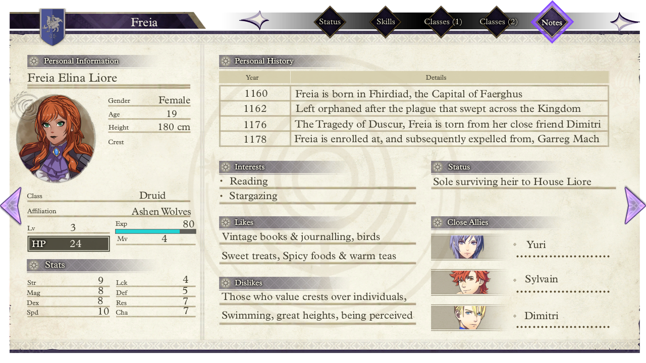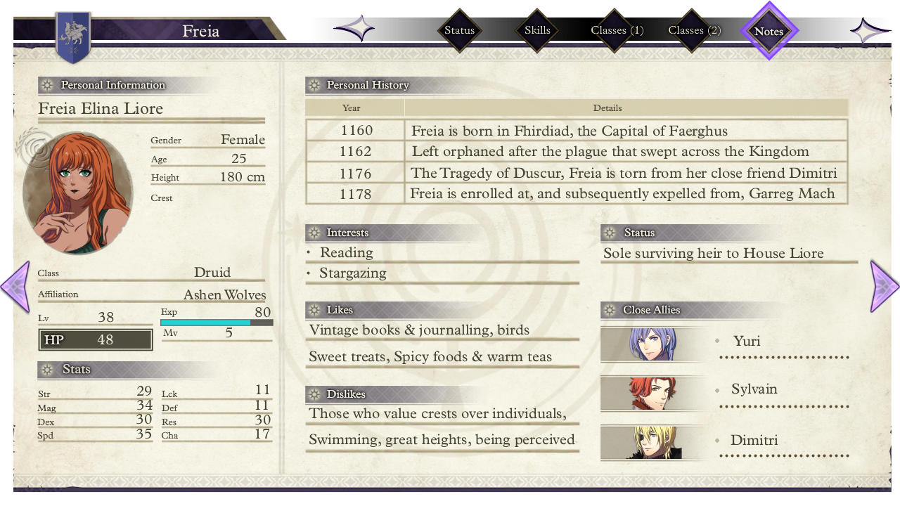 She was born in the year 1160, on the 23rd of the Wyvern Moon, in the countryside of Duscur. Having moved to the capital of the Holy Kingdom of Faerghus, Fhirdiad when she was only a year old. Her mother was a court mage serving the King of Faerghus, and her father an unnamed man from Duscur, both of whom passed away from untimely illness when Freia herself was too young to remember.During her childhood, Freia was raised close to the Royal family as an unofficial Ward of the King. Despite being the last descendant from a now defunct noble house, she was brought up with the intent of serving the future King, Dimitri Alexandre Blaiddyd. However, after the passing of her mother and the events that took place during the Tragedy of Duscur, Freia was sponsored to attend the Officers Academy at Garreg Mach Monastery, where she would ultimately join the Blue Lions house.In Imperial Year 1178, Freia officially enrolled in the Officers Academy. As an adept of magic and swordplay, she did so under the direct sponsorship of the crown of Faerghus. However, after an unfortunate accident where her magic was turned against another student, she was expelled to Abyss, where she would ultimately take up residence.
