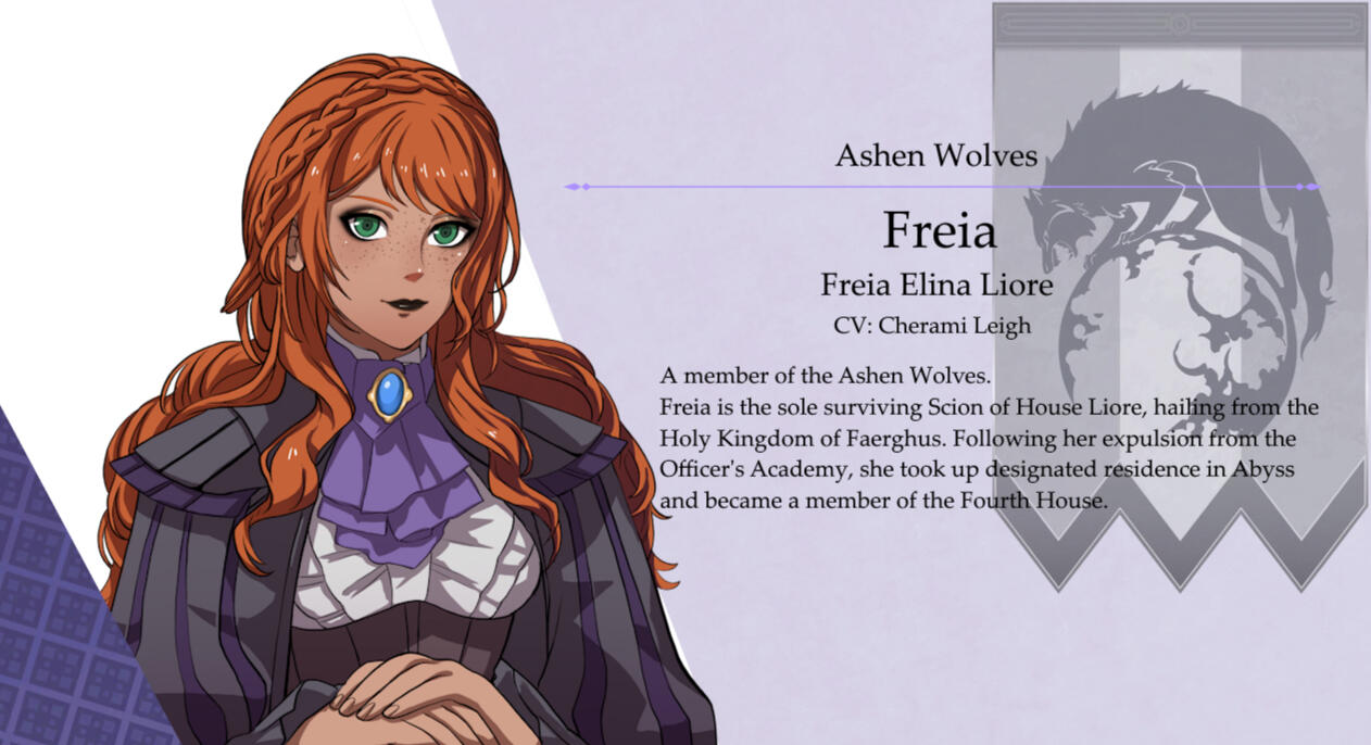 Freia is a member of the Ashen Wolves. She was a student at the Officers Academy, but was expelled after an incident broke out between herself and a student from the Black Eagles house. Despite her bold and guarded exterior, she carries with her a warmth that is said could bring comfort to even the harshest of colds.